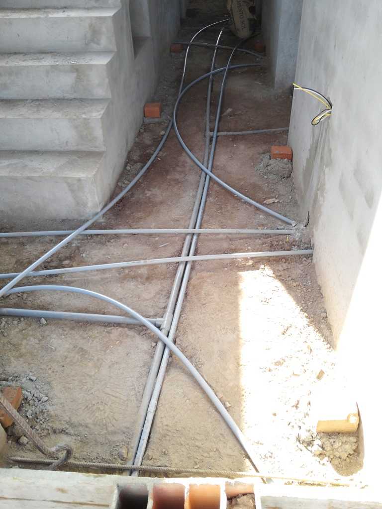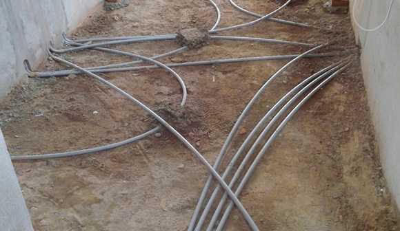 Saturday, Oct 12: An new day, a good day for a concrete pour!! Someone yesterday (or the day before) shut the valve off for water in our casita, but we got it back on today .. pesky construction site, one never knows who left what tool where and why someone did something you discover the next day. Oh well, got it in time to get most of the roof tank filled. The concrete pour will need a lot more than we can supply though, so they did make arrangements with the village to get a direct feed of water for the concrete work today. The plan is to do the west side (bedrooms, kitchen, bathrooms, office) first, and then the next day (or so) do the big meeting room and front area. Before we do the pour today, I took a couple of pictures of the ‘freeway’ system of water lines, electrical lines, low voltage lines (TV, internet, communication), that run mostly through the hallway and the office.
