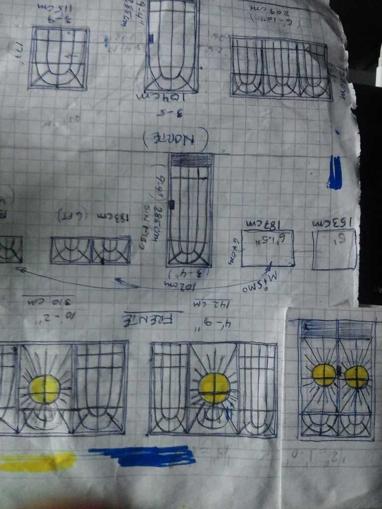 Anyway, Lily’s off to a well needed nap. We were going to run to Maestro today to get a ton of cement for the floor pour but that can wait till tomorrow. She did run to a metal shop yesterday with our window/door man, who needed more material for the fabrication he is undertaking. Hopefully by end of week we can get the front double door in, perhaps at least one of the main front windows. He has a lot of work ahead of him yet. Here is the sketch that we have been working with. We started with a pattern book of his and although there are hundreds of different patterns including some interesting ones with musical notes, guitars, condors, yadda, yadda, you can not find a single church or christian theme pattern. So, we designed our own. Looking forward to it being made. Of course then we need to get the glass man out to add glass to it.