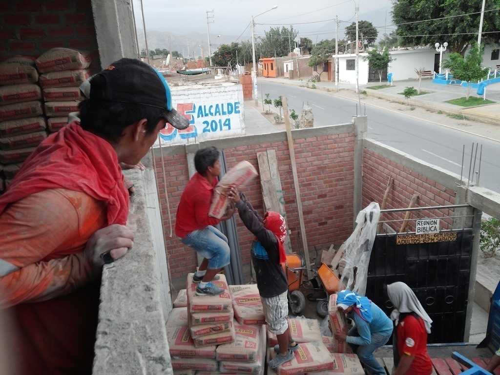 After a late lunch for the crew, they needed to go down the street for a major concrete pour of a new ceiling, about 80 square meters. They had the road blocked for their large pile of sand and gravel that was in the middle of the street. Hope to get them to resume full force in the morning. Lot’s to do. Lily and Abel made the marks for the plumbing cuts, and we also requested a couple of spickets on the top floor since it’s sort of an open arena setting. Also wanted to be sure to have drain holes at both the back and front of building for rain run off (not that we get much) as well as washing the floor down. The 2nd floor is all enclosed so no need there, but a lot of plumbing cuts will be needed as the tarrajeo progresses. Lily went to Ica for a few errands, one of which was to pick up additional electrical boxes as we are short by about 40. After a late lunch for the crew, they needed to go down the street for a major concrete pour of a new ceiling, about 80 square meters.