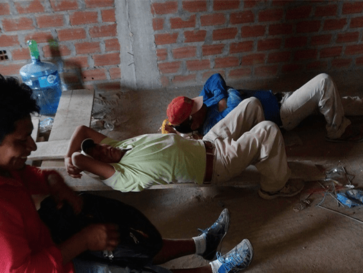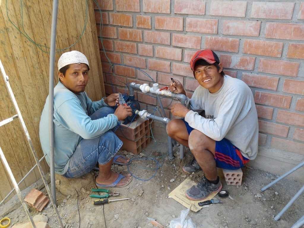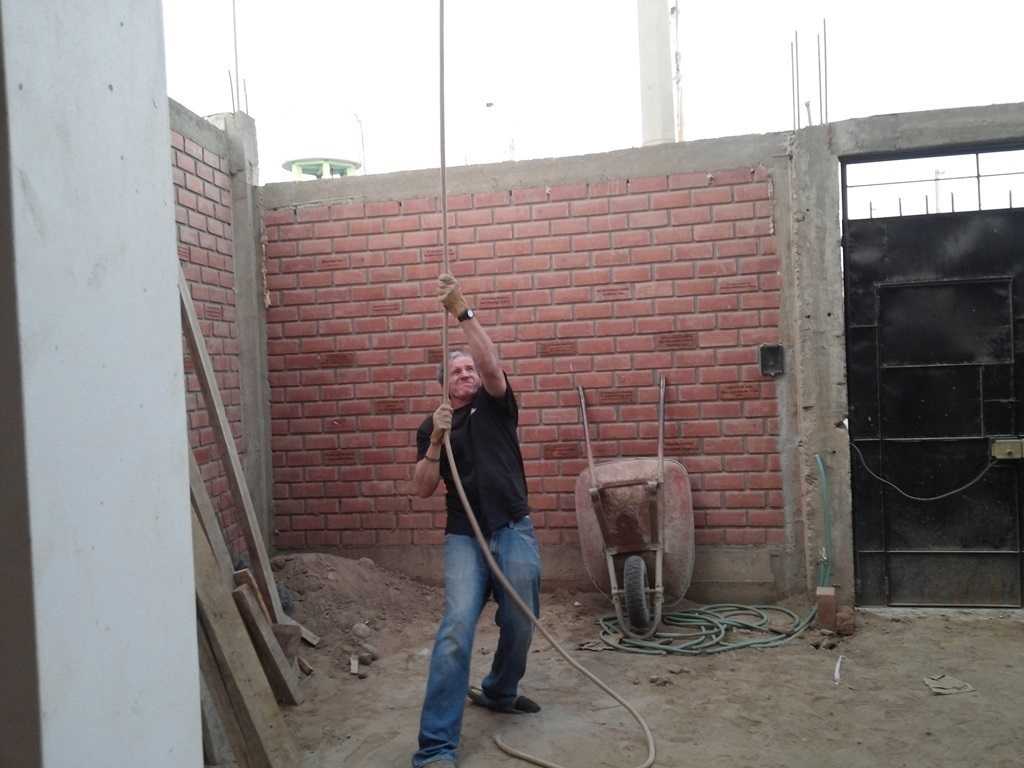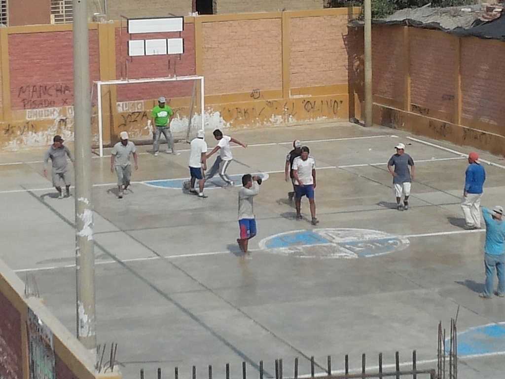Needing to take a break after a full morning of working, the crew stops for a short game of soccer in the court across from the mission. Competitive bunch of guys that do a lot of great steady quality work which need a break from monotony for a short while. After returning to the job, production continues. Percy and Christian stop to pose for the camera while doing one of the first exterior walls (3rd floor) in tarrajeo process. Captured their mud slinging in a short video that I will create a link for. Day ended, didn’t quite get the pump installed yet, but a lot was accomplished. On to another day.