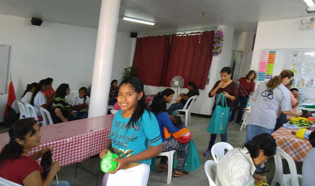 Our third day of teaching knitting and crocheting gets underway, but this time with a greatly depleted staff. Today we got a little break with the youth students dropping from 29 to 24, but it seemed that many of them had little tag-a-long siblings that needed babysitting so that sort of washed the ‘break’. Anyway, it went well though, and we kept them in training as long as possible, overlapping with the adult program downstairs until we needed the workers all to work with one group. So much was accomplished. The Adults came in at 4pm and different than the youth group, this group grew again. From 15 to 19 and now to 27! Who knows how many tomorrow.