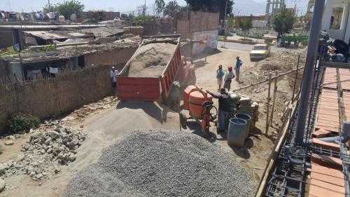 After breakfast, went out and verified all was ready, crew was ready, new delivery of sand (S./540, about $150 worth) arrived. Time for the show to begin. Although the work began sometime after 10am, the focus was to fill the large trough all around the building first, as well as the two beams that are being made across the mid-section. Once these are filled, then the eleven smaller channels between the block would be filled, lastly, a top layer of a few centimeters to cover all the electrical tubes. During all this work, Abel (our contractor) was doing the directing and smoothing as everyone else was part of the bucket brigade. While the buckets were coming up, there were some last minute rebar ties being put in place by both Charlie and even Julio.