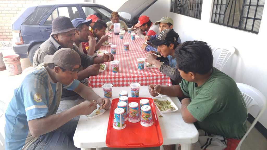 The work progressed rather rapidly but was also wearing on Abel who was constantly working with every bucket that came up once the major holes were filled. The bucket brigade got to sit down between mixes but no reall rest for Abel. We had about 14 workers total and we arranged to feed them after the effort.After all was done, we had all the workers join us on the front porch for a meal. Lily had Kelly’s mom cook for the whole crew. A great rice, chicken, salad and punch meal. Julio took time to sit with the men as well to get to know them. Big Day!