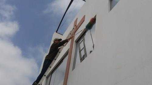 14 October, Friday – New day. We have the welder finishing up the framing on the 3rd floor. Apparently he hired Charlie to help him with the painting of the frame today, before he hangs the fabric hopefully as early as tomorrow.I also worked with Julio to put up the LED lights on the cross in the front of the mission. We bought some adhesive yesterday to use, since we didn’t trust the sticky backing on the light strip to last long or to adhere very well to the cement cross
